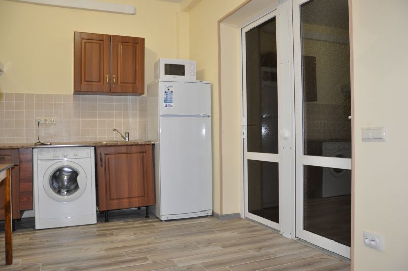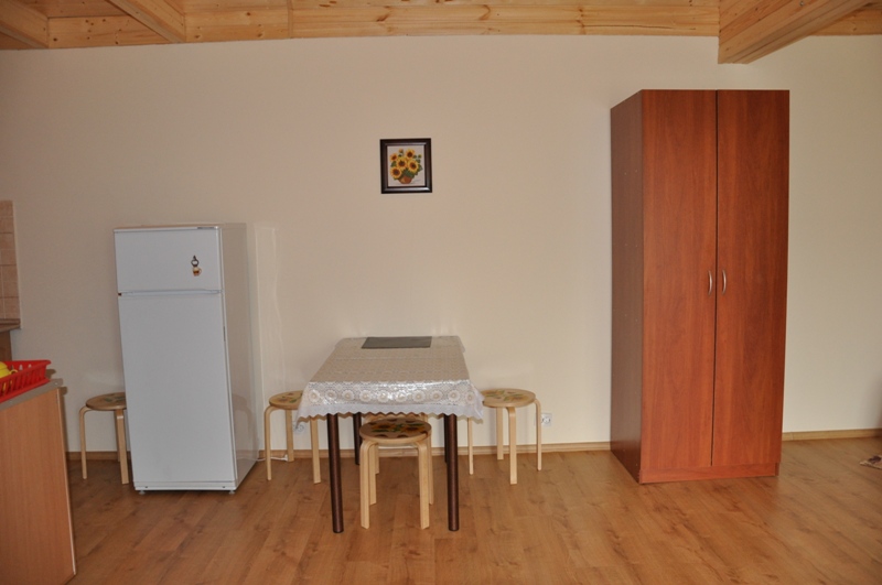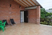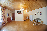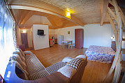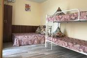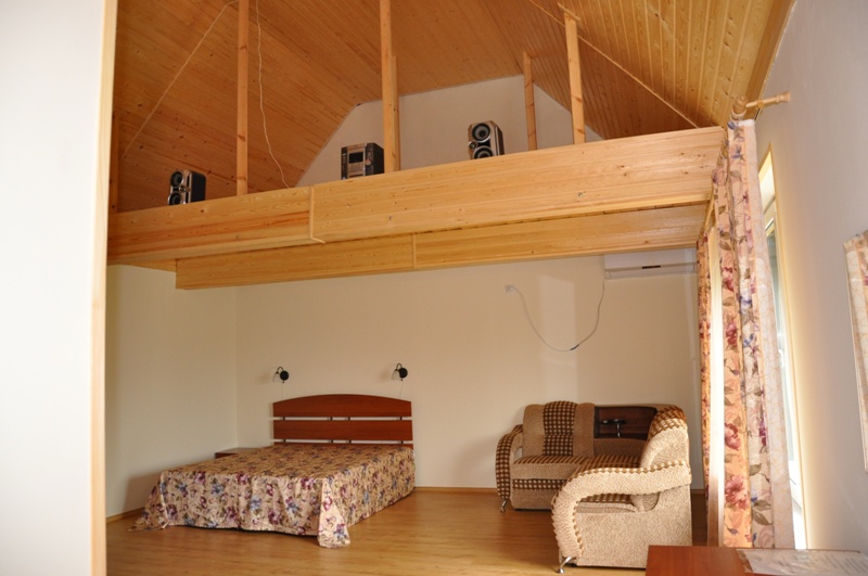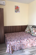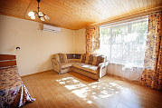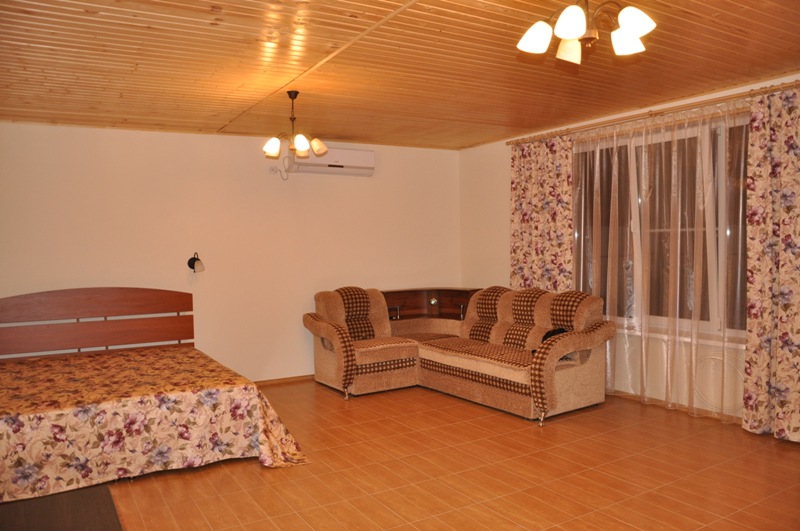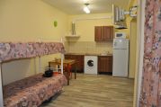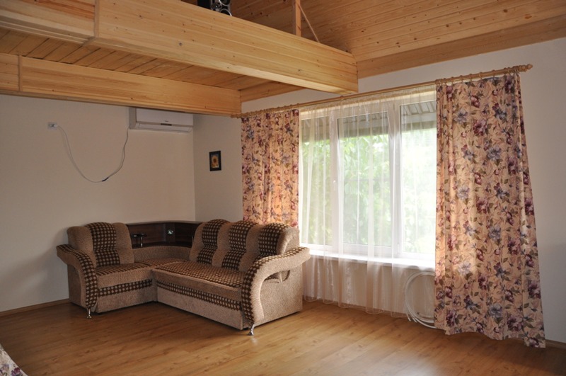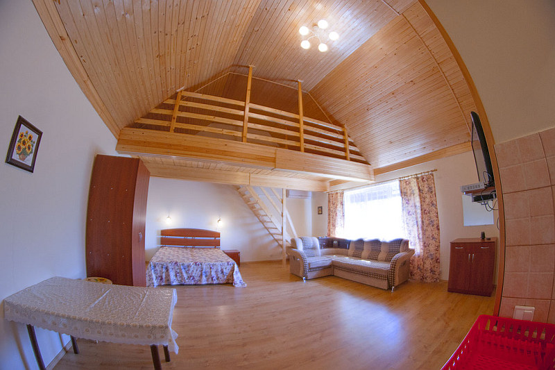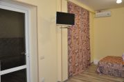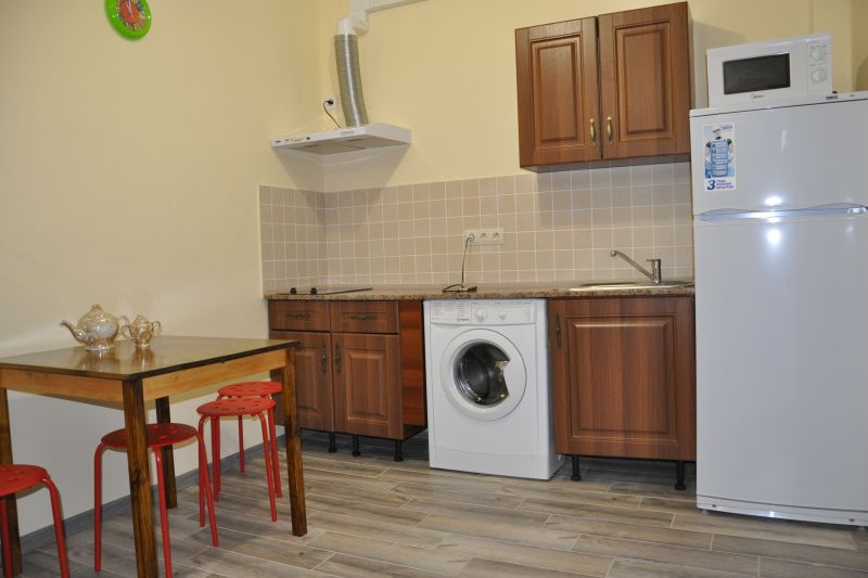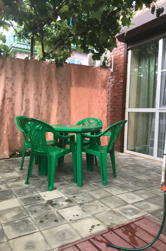 Расположена на первом этаже, отдельный вход. В студии есть санузел (душ, умывальник, унитаз), кухня ( печь, холодильник, обеденный стол, стиральная машина/автомат, посуда , микроволновая печь), в комнате - двуспальная кровать, двухъярусная кровать, шкаф, ж/к телевизор, сплит система.Индивидуальная зона отдыха с отдельным входом в тени виноградной беседки с садовой мебелью.