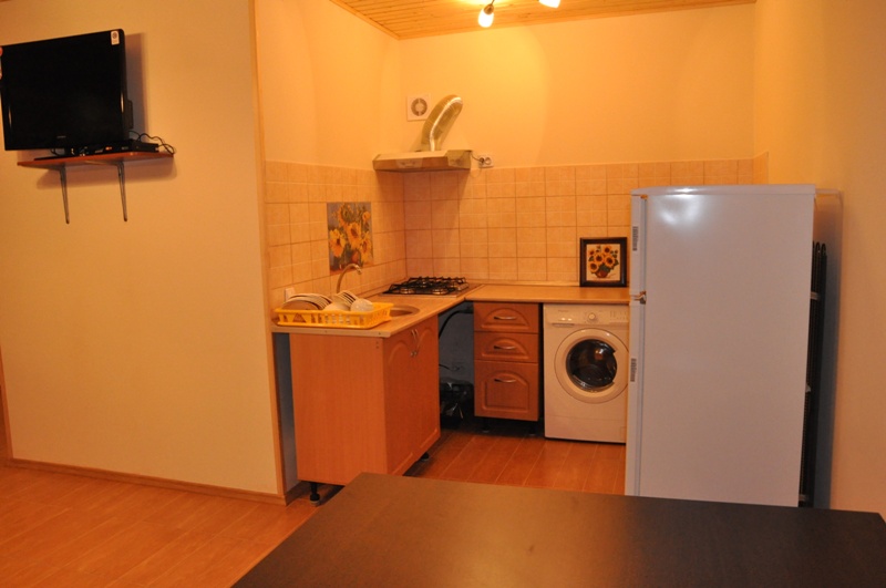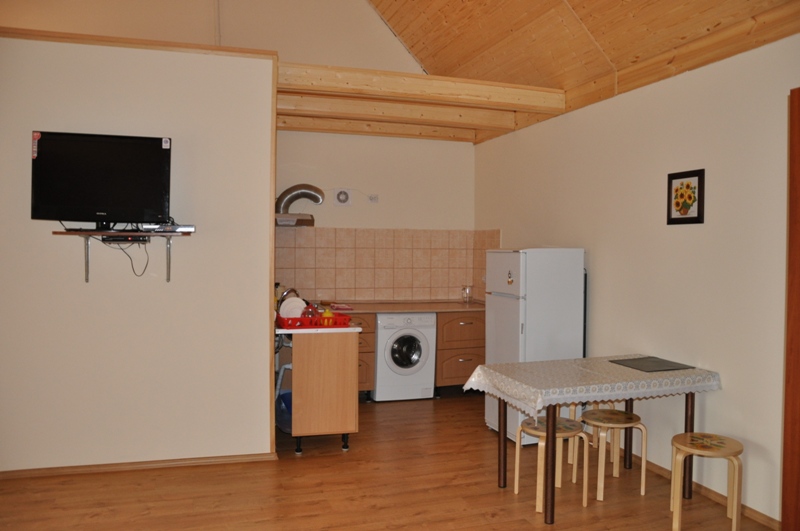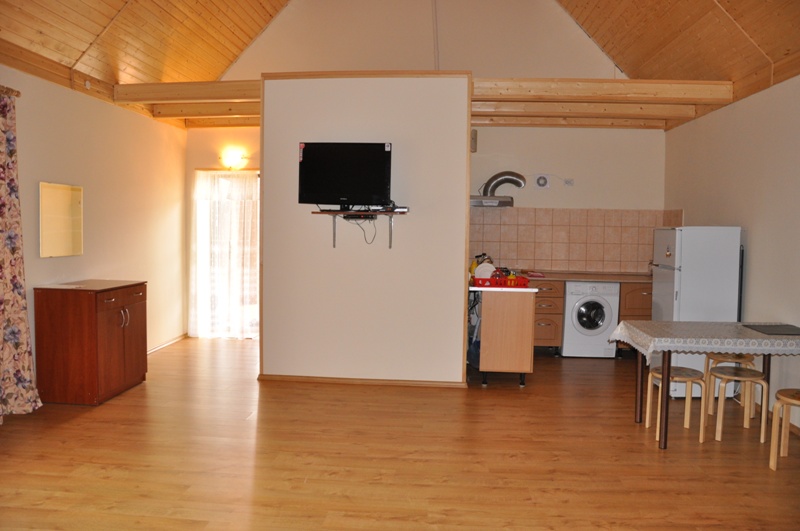 В каждой из студий , имеется кухня (стиральная машина-автомат, газовая печь, холодильник, обеденный стол и вся необходимая посуда), санузел (туалет, душ, умывальник). В комнатах есть сплит система, большой двуспальный диван, двуспальная кровать, шкаф и другая необходимая для комфортного отдыха мебель. Студия оборудована большими ж/к телевизорами, спутниковым ТВ и DVD